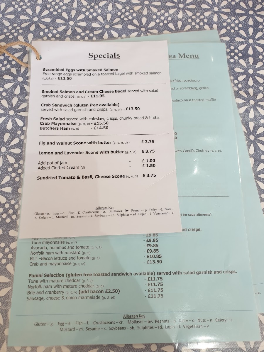 The menu highlights include sumptuous options like Tuna With Mature Cheddar and Norfolk Ham with Mustard sandwiches, alongside a selection of freshly baked scones, such as Lemon And Lavender and Fig And Walnut, all reasonably priced. Breakfast enthusiasts will rejoice in the Bacon Sandwich and Poached Eggs With Avocado & Bacon.